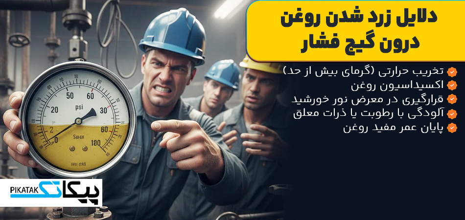 اگر روغن درون گیج فشار زرد شده باشد، استفاده از گیج فشار توصیه نمی شود زیرا می تواند منجر به مشکلات و حتی خوانش مبهم فشار شود. زرد شدن روغن درون گیج فشار روغنی می تواند ناشی از عوامل مختلفی باشد که در ادامه به مهم ترین آن ها پرداخته میشود: