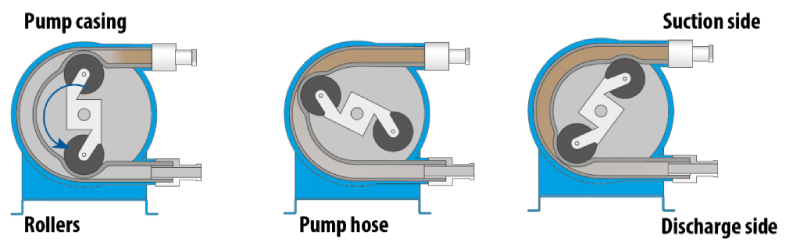 این پمپ ها با غلتک های نصب شده بر روی روتور کار می کنند که در گردش مداوم لوله را فشرده کرده و سیال را به صورت پیوسته به جلو هدایت می کنند. به دلیل تماس نداشتن سیال با قطعات فلزی، این نوع پمپ بسیار مناسب برای انتقال مایعات حساس، دارویی و استریل است.