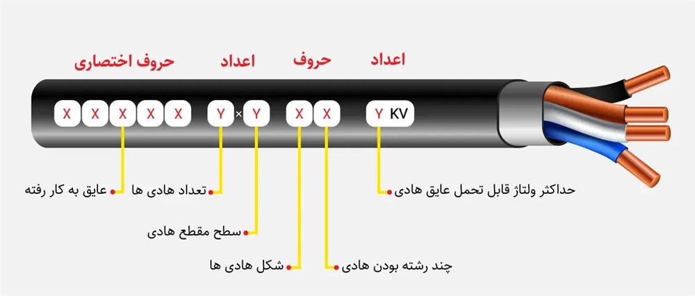 - چاپ مشخصات: مشخصات فنی مهم مانند نام سازنده (مثلاً خراسان افشارنژاد)، سطح مقطع، ولتاژ نامی و استاندارد ساخت (مانند ISIRI 607) روی بدنه چاپ می شود.